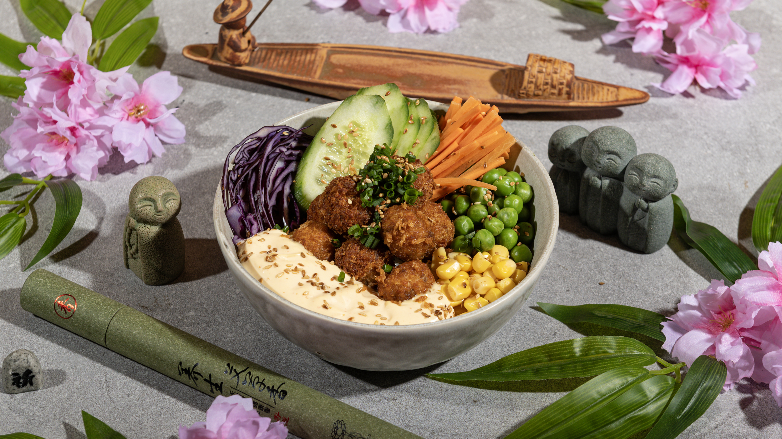Salmon balls, rice, baby corn, corn, red cabbage, carrot, green onion, sesame, teriyaki sauce, poke sauce
