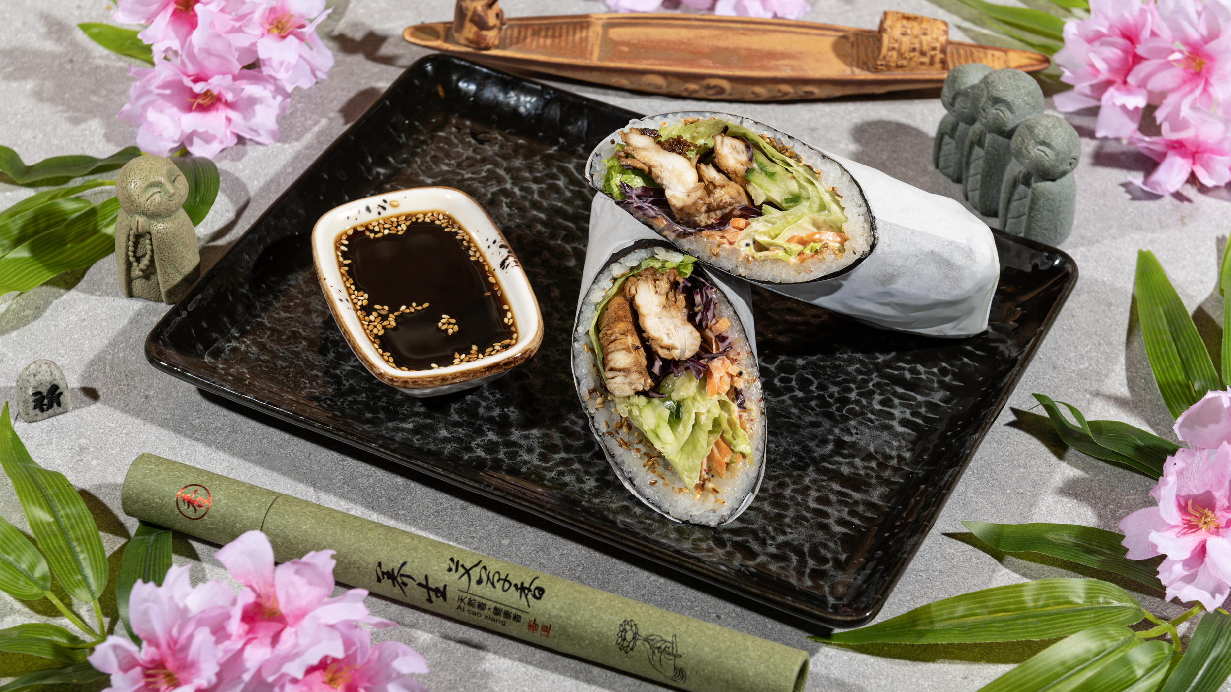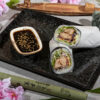 Salmon, red cabbage, carrot, cucumber, lettuce, teriyaki sauce