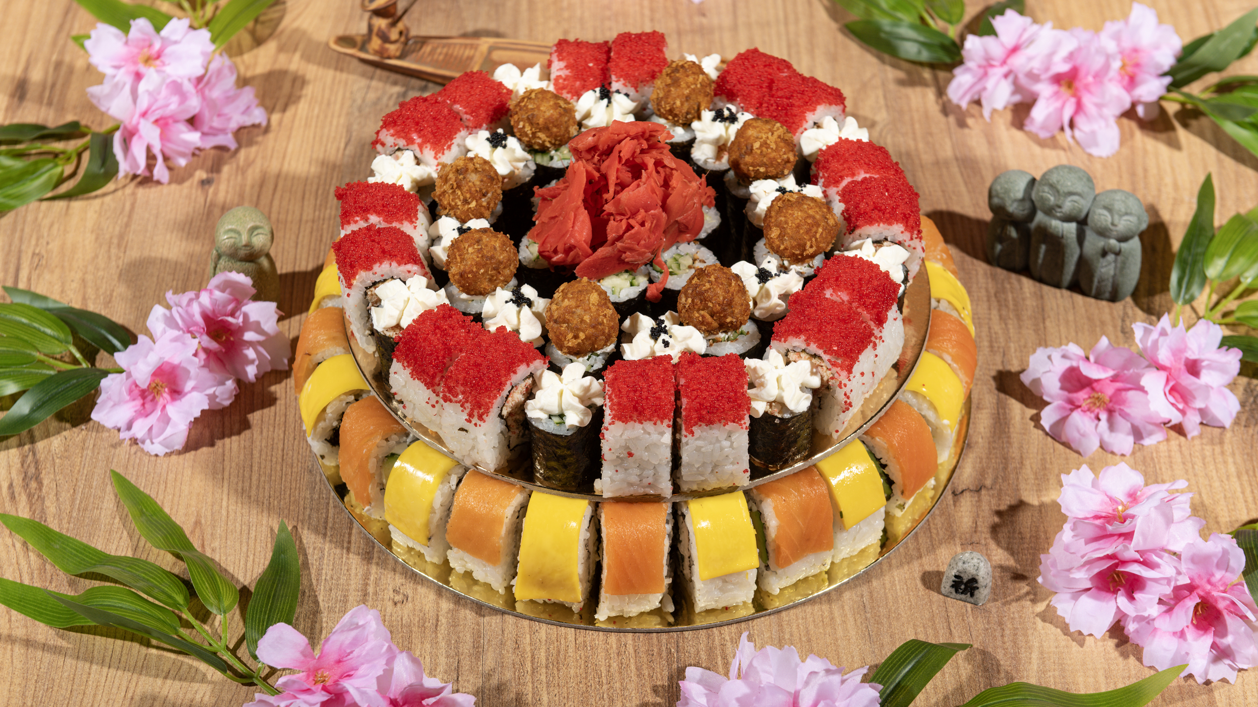 Rice, Mitsukani vinegar, sugar, salt, ginger, wasabi, soy, nori